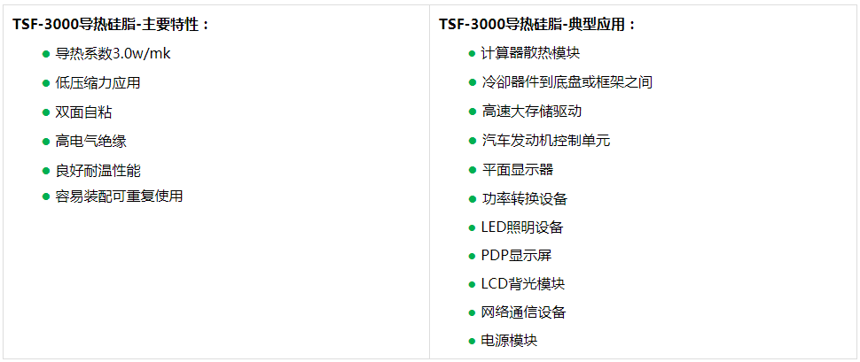 1、LED行業(yè):立凡TSF-3000導(dǎo)熱硅膠片用于鋁基板與散熱片之間,用于鋁基板與外殼之間。 2、電源行業(yè):用與MOS管、變壓器(或電容/PFC電感)與散熱片或外殼之間導(dǎo)熱。 3、通信行業(yè):TD-CDMA產(chǎn)品在主板IC與散熱片或外殼間的導(dǎo)熱散熱。 4、機(jī)頂盒:DC-DC IC與外殼之間導(dǎo)熱散熱。 5、汽車電子行業(yè)的應(yīng)用。 6、PDP /LED電視的應(yīng)用:功放IC、圖像解碼器IC與散熱器(外殼)之間的導(dǎo)熱。 7、家電行業(yè):微波爐/空調(diào)(風(fēng)扇電機(jī)功率IC與外殼間)/(熱敏電阻與散熱片間)。 8、電腦行業(yè):用于筆記電腦,平板電腦,臺式機(jī)電腦間CPU和散熱器之間的導(dǎo)熱。 TSF-3000導(dǎo)熱硅膠片性能參數(shù)表